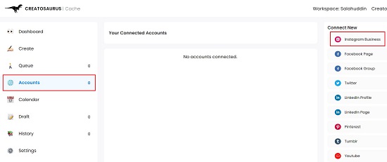 3. The first step is to connect your Instagram account. You must remember that presently only Instagram Business accounts that have been connected to a Facebook Page and are managed by you are supported. Click on ‘Accounts’ in the left panel of the dashboard and then click on ‘Instagram Business’ in the ‘Connect New’ panel towards the right of the dashboard.