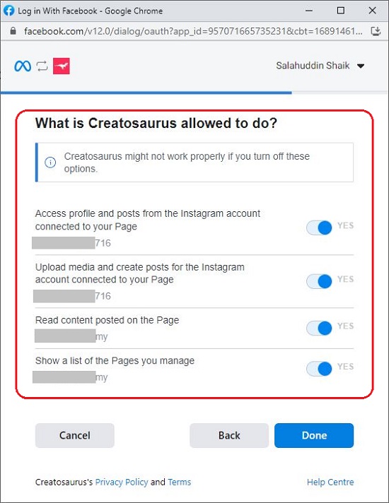 5. In the next page, you will have to select what Creatosaurus can do with the Pages that you have specified. You must leave all the options as default otherwise Creatosaurus may not be able to work properly. Finally click on ‘Done’ and then hit ‘Ok’.
