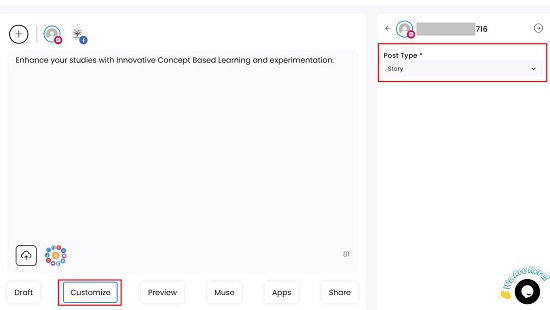 9. Now, click on the ‘Customize’ tab at the bottom of the page and from the panel on the left, choose the Instagram Post Type from the drop-down list such as Post, Reels or Story.
