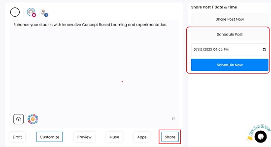 11. Once you are satisfied with the content and its looks, click on the ‘Share’ tab at the bottom and then click on ‘Schedule Post’. Use the ‘Calendar’ icon to choose a precise Date and Time and then click on ‘Schedule Now.