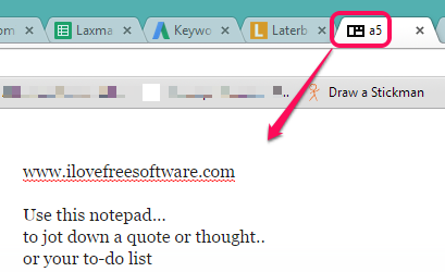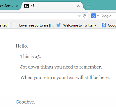 a5 is a free online notepad to store text or your to-do lists temporarily. Your stored text remains with you until you clear your browser cache or delete that text yourself. You can also modify entries and close the tab. Next time when you will open its homepage in a tab, all that text will be visible to you.