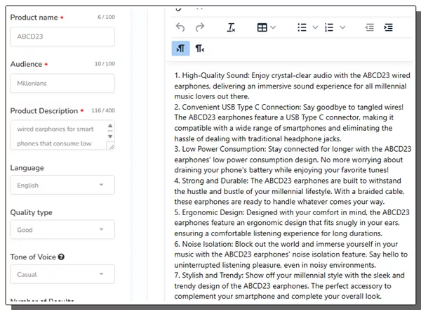 In the same way, you can use the description and features list generator tool. After specifying the product information, just hit the generate and it will generate numbered list of features that require no to minimum tweaking.