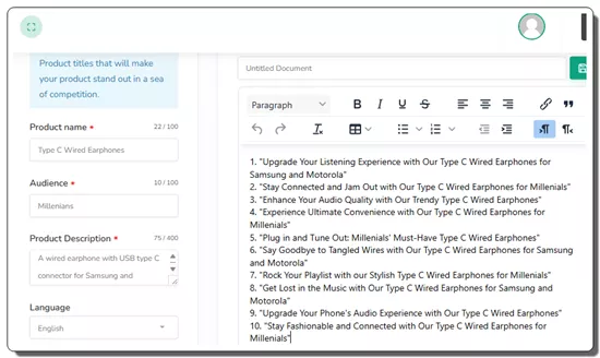 Now, let’s select the title generator first. It will open a form like interface where you have to specify what is your product is about. Enter its name, your target audience and the tone type. In the use Generate button and it will show you a list of titles that you can consider.