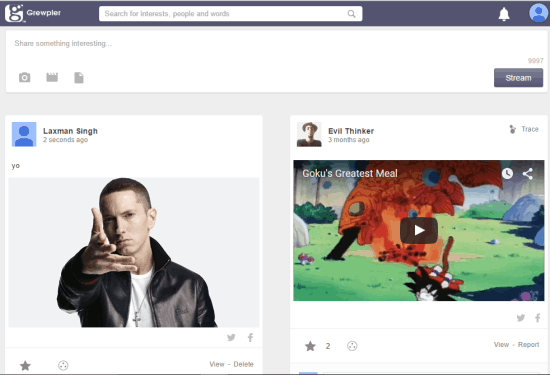 Grewpler is a free website to find and share documents, videos, and images. Unlike Facebook and other social networking sites, it has the advantage of uploading files (like Word file, TXT, etc.). You won’t be able to view the documents (but can download), but images and videos can be viewed easily. All your posts remain public and other users can like your posts, add comments, and also re-post (known as Fame) them. You will get real-time notifications for every single action.