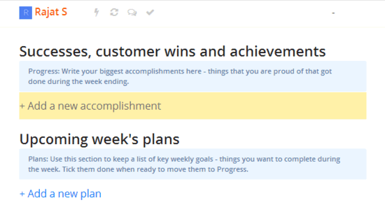 - Your Form: Your own work related information, like upcoming week’s plans, projects you’re working on, completed tasks, failed tasks etc., is entered under this section.