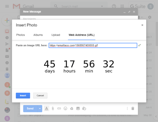 Since Gmail by default does not have an option for HTML email, you can use the countdown timer Image URL. To do that, click the Attach File option in the compose box. This opens the attachment popup. Now, head to the Web Address (URL) section, paste the countdown timer Image URL there and click Insert. This adds the countdown timer to Gmail.