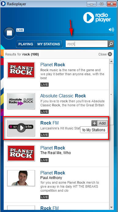 Open the Radioplayer website and click the Listen tab on the right side of the Home tab to launch the Radioplayer desktop client. Now, Start by searching for online radio stations that you are interested in and then by building your favorites list. In the top right corner you’re gonna see the search box, type in for example “rock“, and you should receive a list of stations which are related to rock.