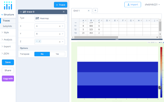 Plot.ly is a popular online graphing tool where you can plot various types of graphs and charts online including heat map chart. To general a heat map here, add your data in the data grid; you can also import data from a CSV or Excel file. After adding the data, create a new trace and select Heatmap option. This opens a heat map trace left to the data grid. In the heat map trace, select your data columns for X, Y, and/or Z axis. Based on your selection and data, Plot.ly generates an interactive heat map. You can analyze the heat map here and tweak it’s appearance by changing data point color and labels.