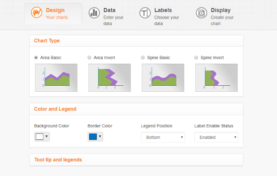 Meta-Chart.com is an online data visualization and charting application. This app doesn’t have a dedicated heat map tool but you can use it’s Area Chart tool to generate less complex heat maps. To do that, first, select the orientation of the chart and choose background colors and legend position. Then, move to Data section and enter your data or import from a CSV/Excel file. After that, you can add the labels and choose a text format for them from the Labels section.
