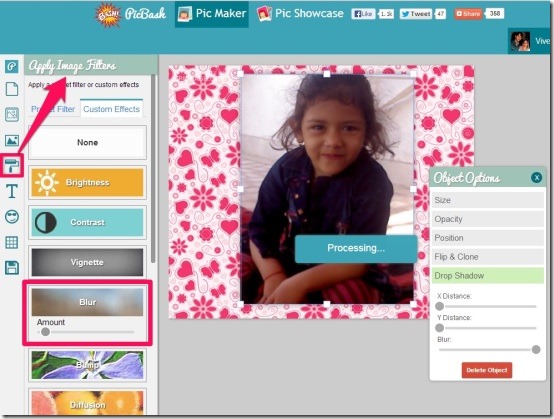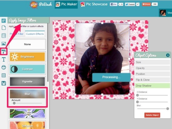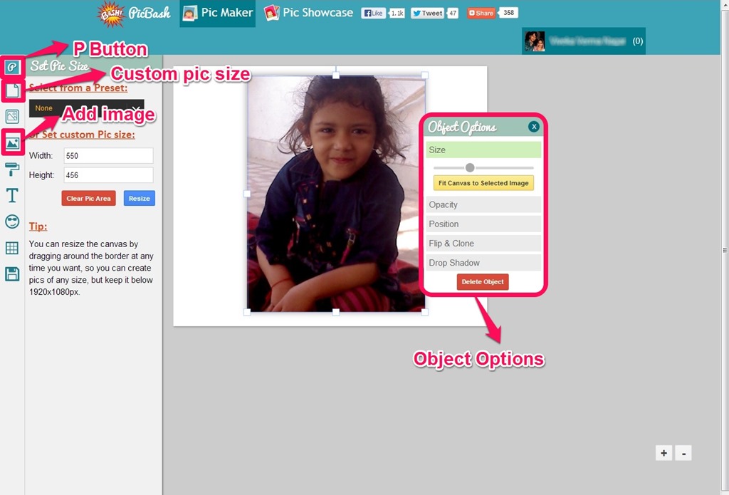 Once you click on the icon, it asks you to login with Facebook, you can either proceed with it or you can opt to make pictures as a guest user. Choice is all yours!!! I choose to login with Facebook and add an image from my album. Then you need to hit on the P button located on the topmost left corner of the window so that you are able to set custom pic size. You can customize the size, Opacity, Position, Flip & Clone, Drop Shadow or delete your image using Object Options. You can use this whenever you need to make general changes in the appearance of the image.