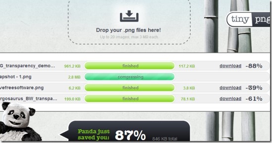 Screenshot above shows homepage of TinyPNG where you can batch upload png files (by drag n drop) on the available box and it will start compressing them. You can upload total 20 png images at a time with maximum 3mb size for each file. After finishing the compression process, it will provide you download option for each png image. Along with this, it will also show you reduced size (in percentage) for each png file. See the below screenshot: