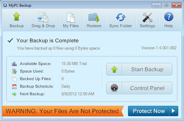Default interface of MyPCBackup can be seen on the image above. As you can see the free account is a trial which gives you 15MB of storage for your files. It might not be much, but it’s enough if you for example are interested in only uploading text documents, which are for the most part be very large in size. Those who need more space are gonna have to upgrade to one of the paid plans where you receive: