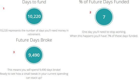 The number one screen shows you how many days you will have to live on your saved money after retirement. The average life span here is taken as 95.