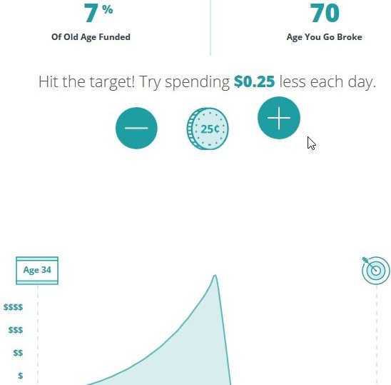 Finally, you are taken to a result screen with these numbers displayed at the top and a 25 cent icon with a plus and minus sign on either side of it. When you click the plus sign it will increase your savings target by 25 cents and when you click the minus sign it will decrease your savings target by 25 cents. Keep on adding by clicking the plus sign till you reach your right goal, where the days covered are 100% and age is 95. That is the exact amount you need to save additionally to your current savings to reach your retirement goals.