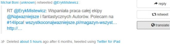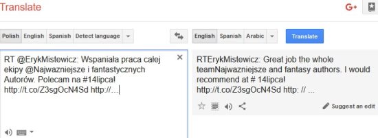 • Translate: This option is only available with tweets that are not in English. The translate options takes you to the Google translate page where this tweet is translated to English. You do have the option to translate the tweet in your native language as well. See the screenshot below which shows a translated tweet.