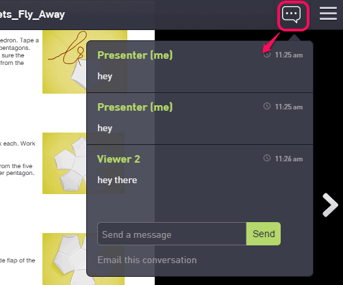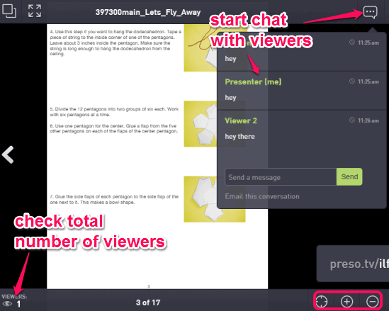 On the bottom left corner of the presentation page, you can see the total number of viewers. On the top right corner, option to chat with viewers is available. And on the bottom right corner, options to zoom in/out presentation slide, view presentation in full mode etc. are available.
