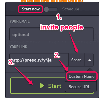 To immediately start your presentation, keep Start now option enabled. A unique link for your presentation will be generated. You can also customize the link using the drop down menu. After this, you can use Share button to invite people to view your presentation. Finally, you can tap on Start button to start broadcasting your presentation.