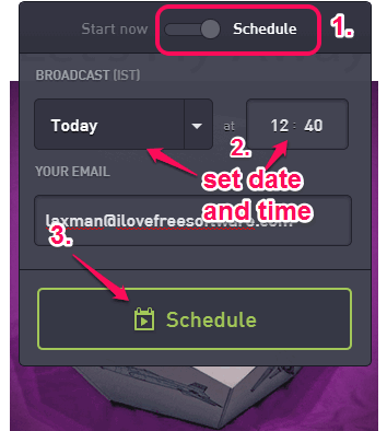 Schedule option is useful to set a particular date and time to broadcast your presentation. After uploading your presentation, you need to invite people, and generate URL of your presentation. After this, you have to switch to Schedule option using the available button. See the screenshot below: