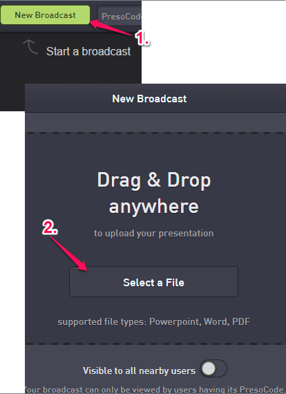 On its homepage, tap on New Broadcast button. A popup will open to add PDF file, Word file, or PowerPoint file. You can either drop file on its interface or can use Select a file button. After uploading the file, it will be processed for broadcasting.