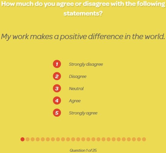 Choose the option which you think appropriately defines your situation. Go through the 25 questions one by one, answering them according to how you feel about the job, company, people, work you do, etc.