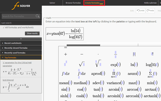 fxSolver is simple and a straightforward website that you can use to easily solve equations. And it’s pretty easy to get started with it. Also, while creating a custom formula, you are given options to easily use the complex mathematical notations like square root, exponential, log, trigonometric functions, integrals, differentials, and some more. You can use them in your formula and then form the final expression.