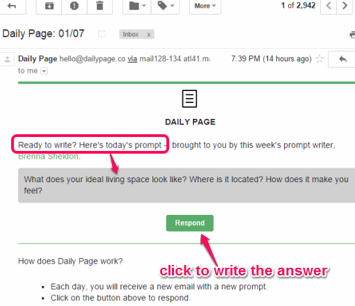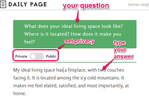 Daily Page is a free website, to respond to random questions asked to you and share your responses online. Once you have signed up with this website, it will send a question to your email address daily, and you need to respond to that question. Your response is posted online and you can make your response private or public.