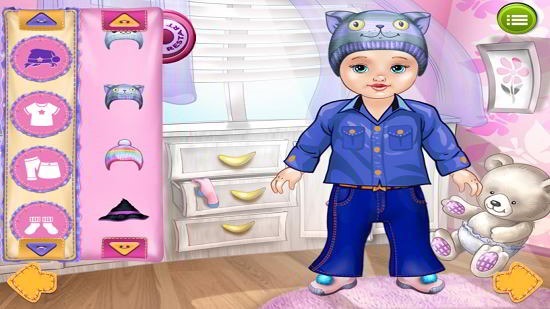You can choose from the variety of clothing options towards the left side of the screen. On the left, you can see the category of clothes, and you can also see the clothes in that particular category right next to the category bar when a category is chosen. Your dressed up baby should look somewhat like the baby in the screenshot below.
