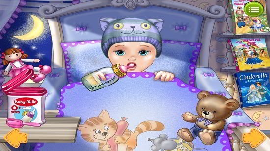 Here you can read out stories to your baby by clicking on any one of the books at the right side of the screen, or you may feed the baby some baby milk before she sleeps. Click on the arrow button at the bottom right of the screen and your baby will finally be asleep. Now you will be taken to the main screen again where you can either choose to play with the same baby or choose a different baby altogether.