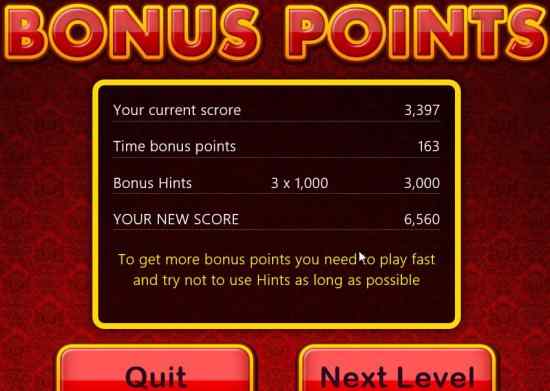 At the top of the screen you can see that top right side has the option to pause the game and the 3 hints you get in case you get stuck. The score is displayed on the top left side of the screen. Remember each time you use a hint, points will be deducted from your score.