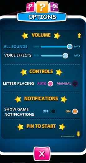 The settings window of the game lets you adjust the sound and voice effects in the app. Apart from this you can pin the app to start menu, turn game notifications on or off, and control the letter placing.