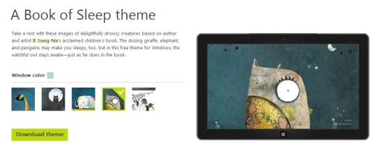 A Book of Sleep theme is a free desktop theme for Windows 7. It’s a nice free theme that will remind you of the sleeping creatures from the fantastic bedtime book: A Book of Sleep, and give your eyes a soothing effect after long hours of working. This free desktop theme is a combination of beautifully animated pictures from the book, window colors, and sounds, that gives a totally new look and feel to your desktop.