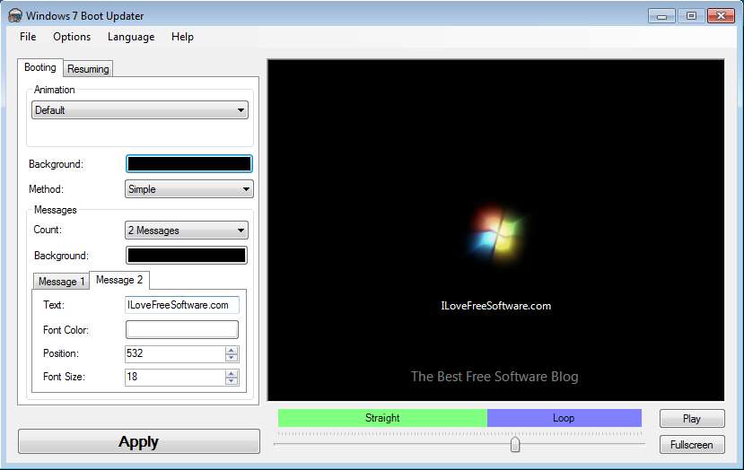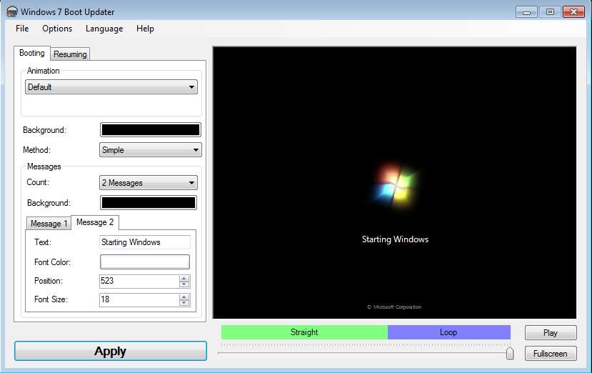 Windows 7 Boot Updater is a free Windows boot logo editor which you can use to edit boot animation in Windows 7. By default during the boot process you will see text “Starting Windows”, nice looking Windows logo animation and at the bottom you should see Microsoft Corporation written. If you ever wanted to change those, and use a boot animation, image or text of your own, now you can do it with Windows 7 Boot Updater.