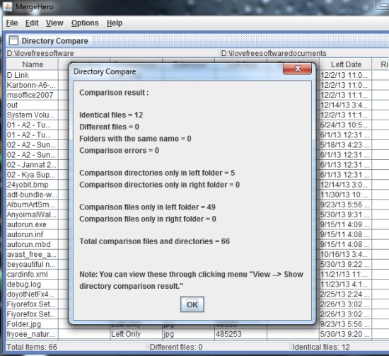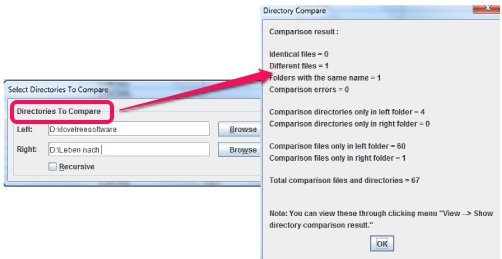 After this, provide the source path of two folders that you want to compare, and hit the OK button. Shortly, it will show you comparison results including total number of identical files, different files, comparison files in left and right folder, total comparison files, directories, etc.