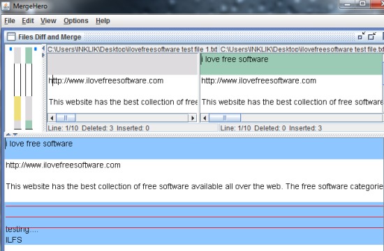 In above screenshot, you can see the interface of MergeHero where it shows difference between two text files. It automatically highlights the differences so that you can quickly find out missing content and can delete unwanted file manually.