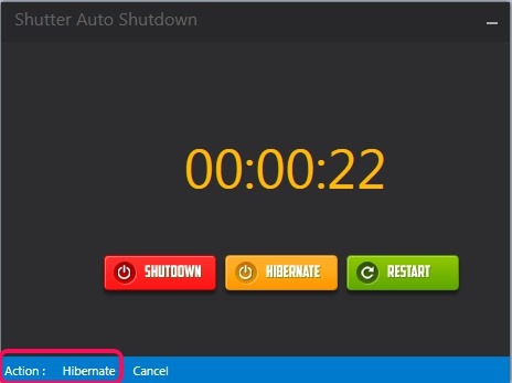 You can see beautiful interface of this software in above screenshot where you have to do only two tasks: enter the time (in hours, minutes, and seconds) and select any of the available button according to your requirement. If you need to hibernate your PC, then enter the desired time and hit the HIBERNATE button. This action will schedule hibernate mode for your PC. After this, countdown will begin and your computer will go to hibernate mode.