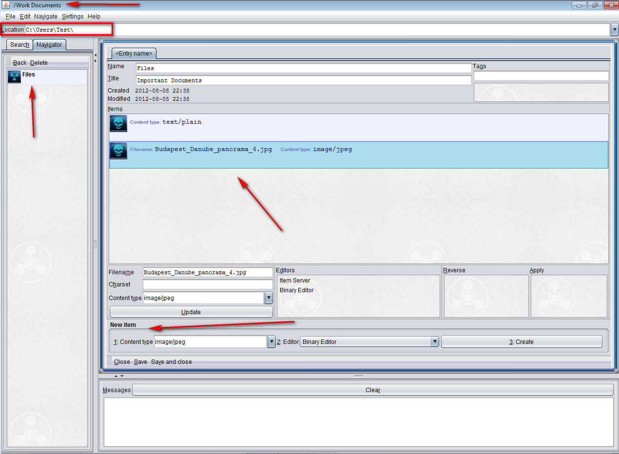 Once we typed in the location of where we’d like our “attache” to be we can create new categories, which are basically folders, and within those folders you can create an Entry, which is basically a file container, as you can see on the image above. New items are added by using the New item field at the bottom of the screen. To add an item you’re gonna have to select the type of files you’re adding, editor which is gonna be used to open and change the files, and then by hitting the Create button, which is gonna open up the standard open file dialog.