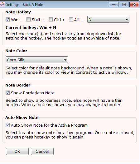 You can change the Settings for the note using the Settings tab. You can select the background color of the note window or make the note window border-less. A cross button is also present which can be used to terminate the Stick A Note Program.