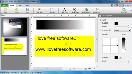 Express Points Presentation Software is a free presentation maker that allows to quickly and easily create beautiful presentations with text, images, and audio files. It provides multiple layouts to start a presentation which you can enhance with more than 30 transition effects. You can create multiple presentation projects and can even import Microsoft Powerpoint projects. Its interface is user-friendly and makes it an easy task for all users to create presentations. Although, it cannot be a strong alternative to Microsoft PowerPoint, but it is useful enough to make good presentations. You can preview the slideshow before saving it to PC and later on you can save it as ExpressPoints Project (*.npp) type.