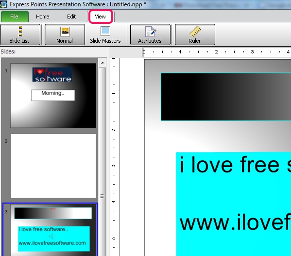 View Option: Using this option, you will be able to show/hide thumbnail panel, slide master editor, attributes panel, and ruler on presentation.