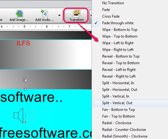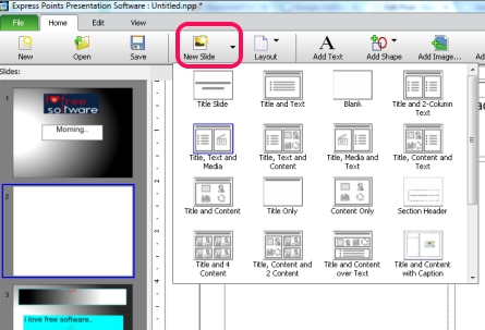- Home Option: It is the most important option of this presentation maker software. Using this option, you will be able to open saved presentation, can add new slides to the presentation, add text, shapes, audio files (wav and mp3), and can add any available transition effect to slides. Multiple slide layouts are available, like visible in screenshot below. Choose any one and add text, images (jpg, gif, bmp, pcx,ras, tif, tiff, psd, etc.), or audio accordingly. It also helps to record own vocals and allows to add them.