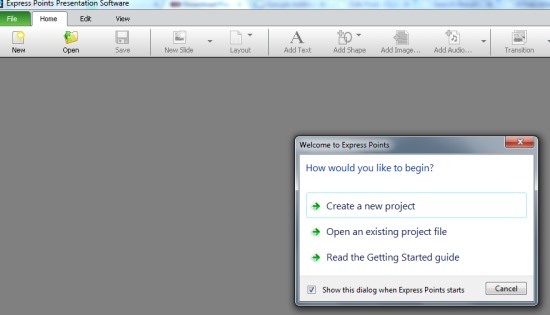 Install Express Points Presentation Software to PC and open its interface. You can find its download link at the end. While using it for the first time, you need to create a new project. If you want, you can even import Microsoft PowerPoint projects using File option.