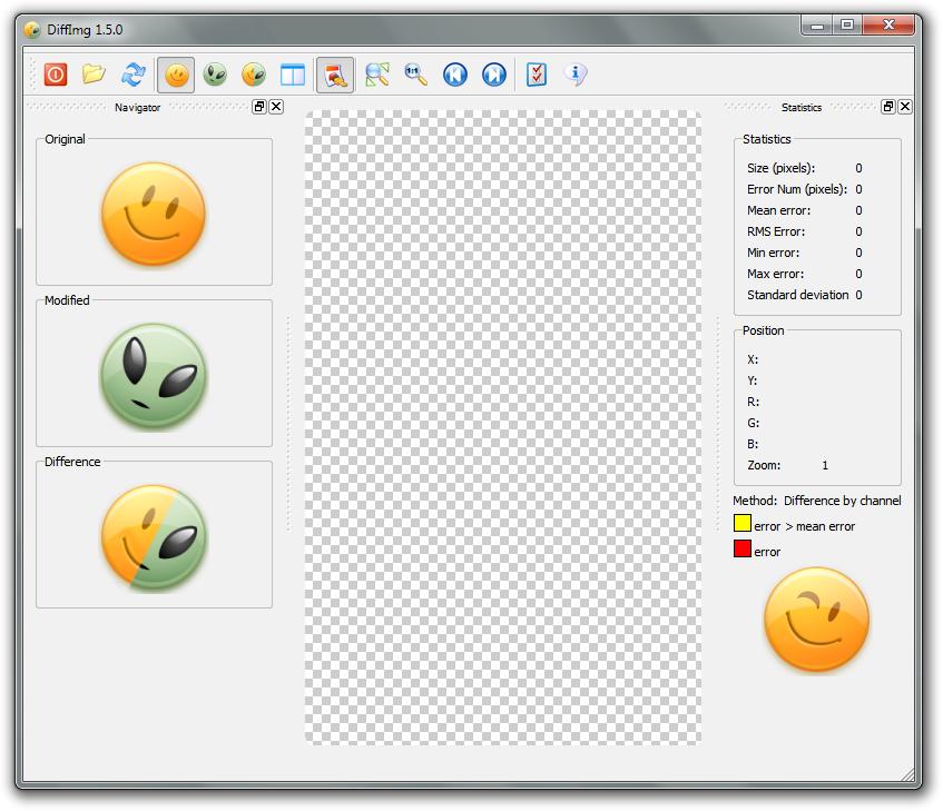 DiffImg interface can be seen on the image above. At the top we have a toolbar where you can enable or disable options like dual panel view, you can open preferences or you can switch between original and modified image.