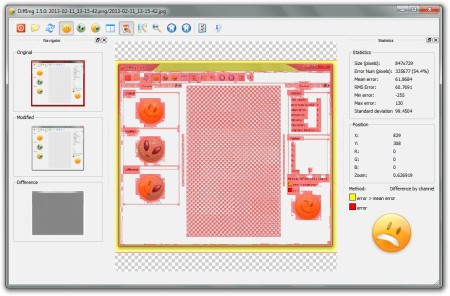 We have simply chosen the same images but they are saved in two different file formats, the original one is PNG and the modified one is JPG. Yellow color shows light and red shows us major differences between photos. So you can see that there are lot of differences even though it’s the same picture. Clicking on the Difference button in the left part of the window will only show you differences between your images. If you enable the dual panel option then you will be able to see the original and the modified image at the same time. The emotion of the smiley face in the bottom of the right part of the window shows you how big is the difference; in our case, very big.