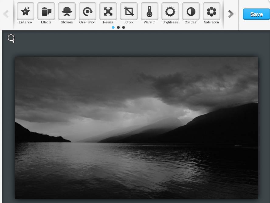 In the image above you can see the first step, the default interface of Photo Zoe. It is very simple with just three buttons available at the top. The left button is for uploading the image that you want to edit online, the one in the middle will open the toolbox, and the last button is for downloading the image, once that it’s completed. Photos that you upload and edit will show up in the center of the screen.