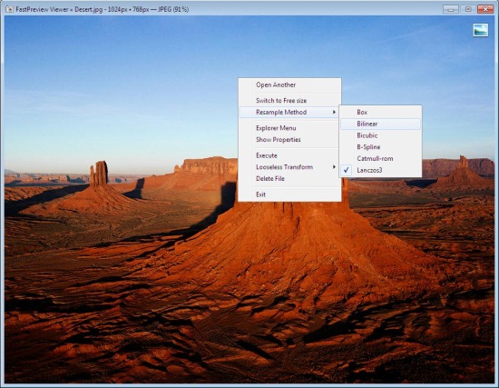 You simply have to click on this preview in order to open the image in its full resolution. The image will be opened in a plain window, with just two options: close and minimize. However, a right click anywhere on the image gives you access to more options provided by FastPreview. These include opening another image, switching to free size or best fit, resampling image, opening image properties window, flipping or rotating image, deleting image, and exiting FastPreview.