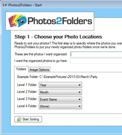 Photos2Folders is a free image sorting software for Windows which you can use in order to arrange photos into folders based on the year, month, day of when they were created and/or the event name where the picture was taken. All this info will be taken from the images, from the EXIF metadata, and they are gonna be sorted into folders using hierarchy that you can change, hence the name Photos2Folders.