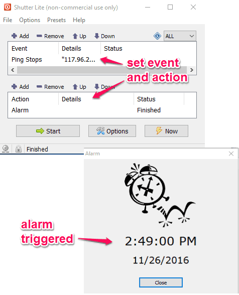 Shutter is a free task scheduler software for Windows that you can configure to receive an alarm after PC is disconnected from the internet. In this software, we will add an event that will continuously monitor internet connection and raise an alarm immediately after internet connection is lost or disconnected. You can also set other actions that will be performed after internet is lost on your PC like sleep PC, hibernate PC, run a program, etc. This free software can run on Windows startup and after going through the steps illustrated below, you will immediately get an alarm after your PC gets disconnected from the internet.