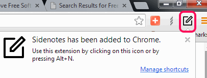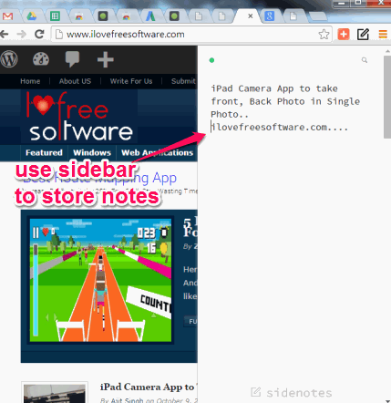 Sidenotes is a free Google Chrome extension that helps to create notes from any tab. Thus, you don’t have to open any text editor, or use any online note taking application to write and store notes. This extension provides a sidebar that can be opened on any tab to store your notes.