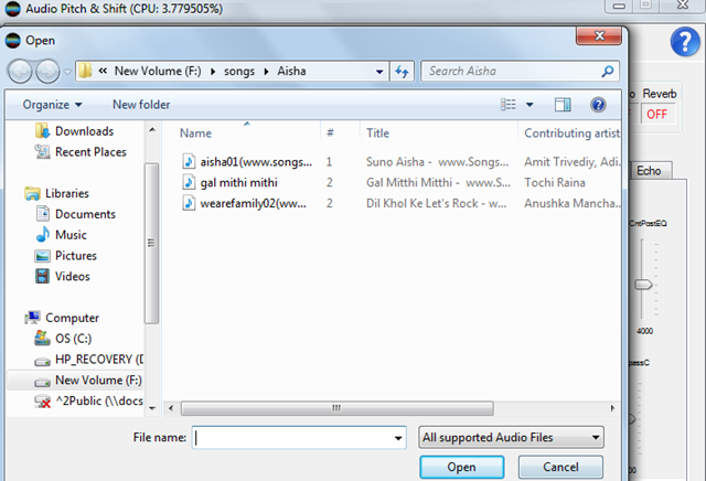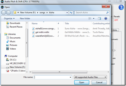 To open any song from your computer you need to click on the up arrow present at the centre of the software near the forward button. Below these settings you can find the volume, mixer and effects settings. The mixer settings allow you to change the volume control on the output and effects change the speed and pitching of the song.