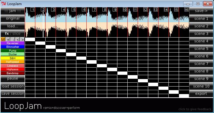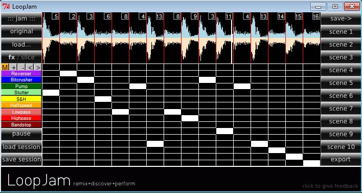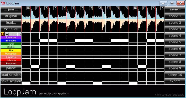 LoopJam is a free music mixer for Windows which you can use in order to mix audio loops both manually and automatically. LoopJam is a very simple application, where you can open up existing loops in WAV format and then mix them in a lot of ways with up to 9 different effects which can be applied to slices or parts of the loop that you are mixing.